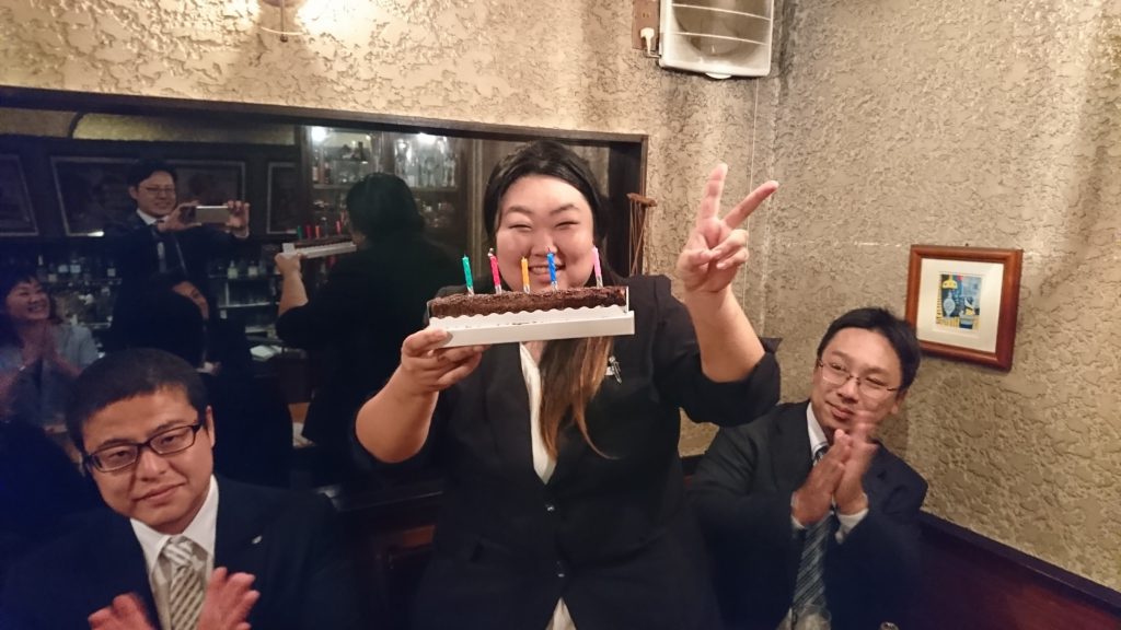 二次会では、9月生まれのメンバーの誕生日のお祝い。小檜山委員長、おめでとう!